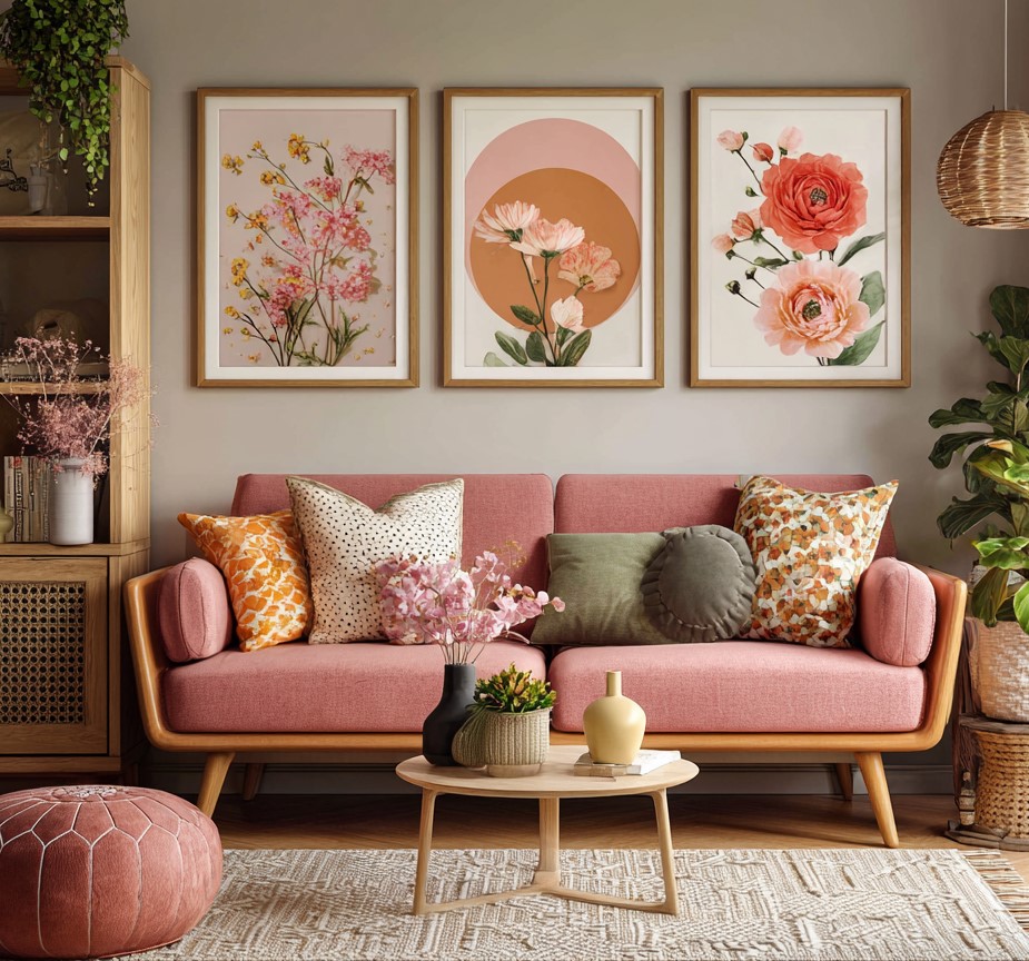 Modern living room with pink sofa, houseplants and art on the wall