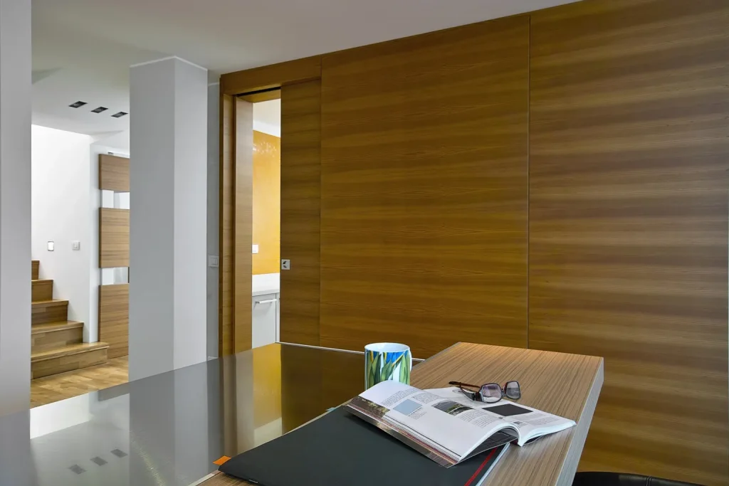 - Space saving: Since the door hides in the wall, you gain full use of the floor area on both sides. You also save wall space that would have been taken up by a swinging door.